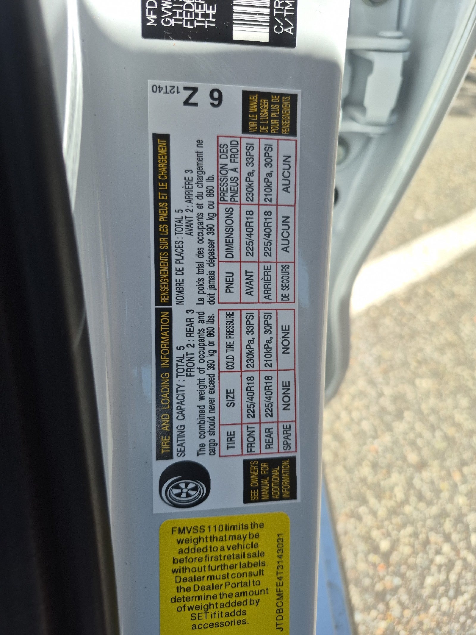 - Front Tire Size: P225/40VR18