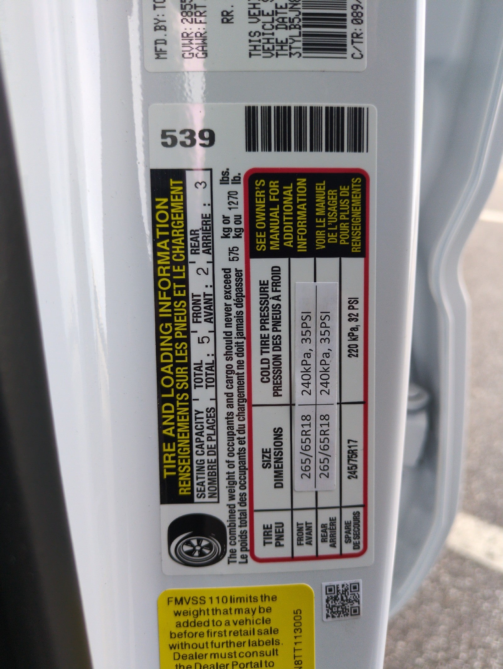 - Front Tire Size: P265/65TR18