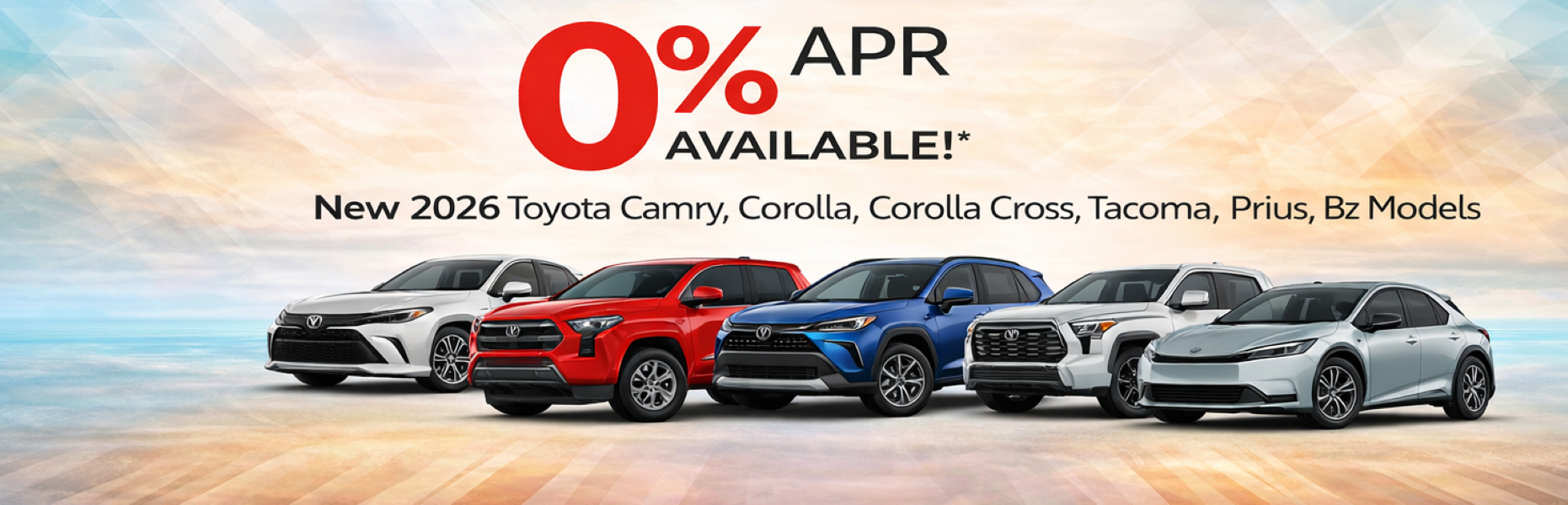 Disclosures: Special Finance offer: 0% APR available for qualified buyers on in-stock New 2026 Toyota Corolla Sedan models, New 2026 Toyota Camry models, New 2025 and 2026 Toyota Tacoma models, New Toyota 2026 Prius models, New 2026 Toyota Bz models, New 2025 Toyota Corolla and Corolla Cross models. 0% APR for 36 monthly payments of $27.78 for every $1,000 financed; 20% down payment required. Terms available through dealer approved lender to very well-qualified customers. Not all customers will qualify. $40,000 loan limit. No negative equity can be rolled into loan. Not available with any other promotion or discount. Must take delivery from dealer stock by offer end date. Offer cannot be combined with SETF Lease Cash, Customer Cash, Trade-in Assistance, or Special APR offers. Excludes dealer added accessories tax, tag, registration, title, and $799 Dealer fees.